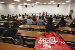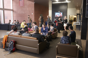 Student ambassadors and Band Directors Thomas Leslie and Anthony LaBounty talk with high school students on campus for the All State Band competition April 19, 2013 at the University of Nevada, Las Vegas: digital photographs