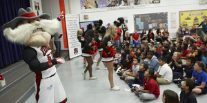 UNLV students, athletes, staff and Hey Reb are lead by Earnest Phillips during a rally for students taking the CRT's at Ruth Fyfe Elementary School April 18, 2013: digital photographs