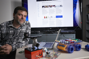 UNLV Media Studies Professor Julian Kilker poses with a technology kit that will be made available to local high school students as part of a technology experience exhibit: digital photographs