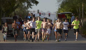 Students from around the U.S. participating in the National Junior Classical League convention run a foot race around campus: digital photographs